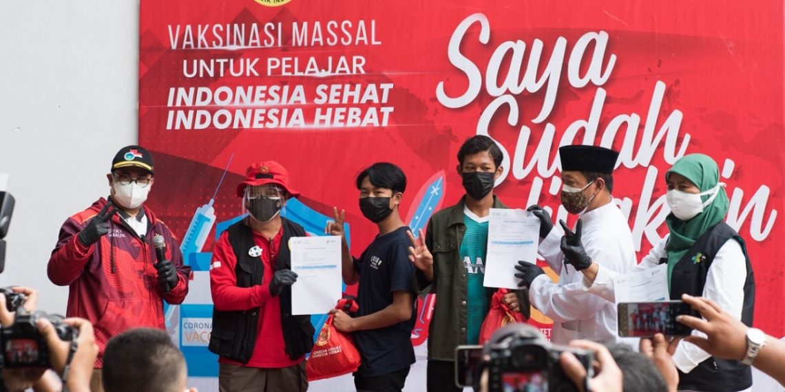 Karawang (2/8). Ponpes Sumber Barokah menjadi lokasi vaksinasi massal 1.000 santri yang diadakan Badan Intelijen Negara (BIN) bekerjasama dengan Dinas Kesehatan Kabupaten Karawang. Pemerintah menargetkan 70 persen herd immunity, terutama para pelajar dan santri agar kegiatan tatap muka bisa berjalan.
