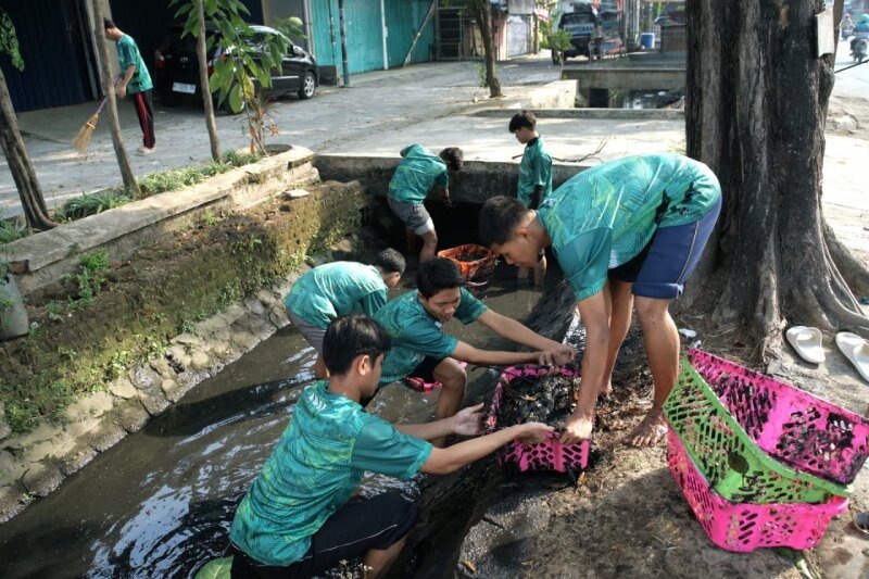 Kerja bakti di area lingkungan pondok pesantren termasuk membersihkan parit. Foto: LINES.